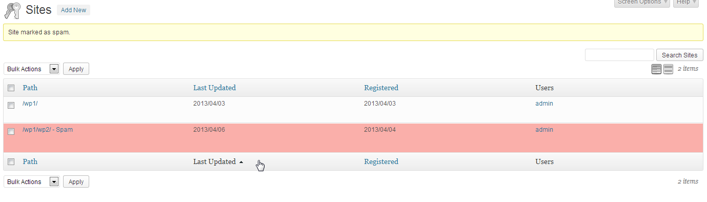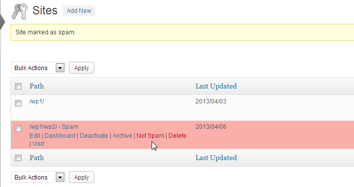 Hover over the path for the site that you want to mark as spam and you will see a menu appear beneath that pat for listed WordPress installation. In order to mark the site as SPAM, then click on the SPAM option in the menu.