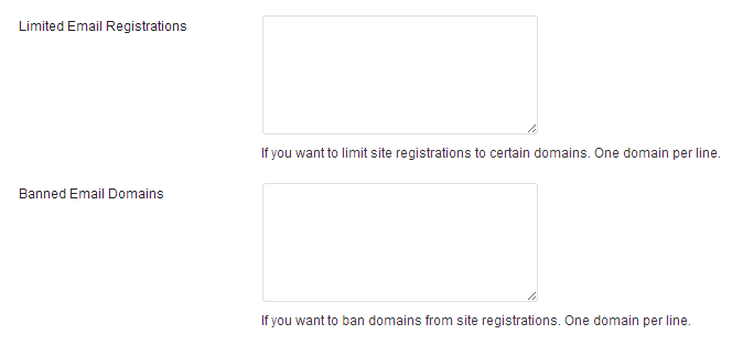 If you wish to limit email registrations so that only specific domains can register, then click in the Limited Email Registrations field. Registrations will only be allowed for the domains listed here.This completes the tutorial on limiting email registrations for your Wordpress MS site. Remember that these settings can possibly prevent legitimate users from logging in to make comments on your website. If you need further information on your networked Wordpress installation, please go to Wordpress Education Channel.