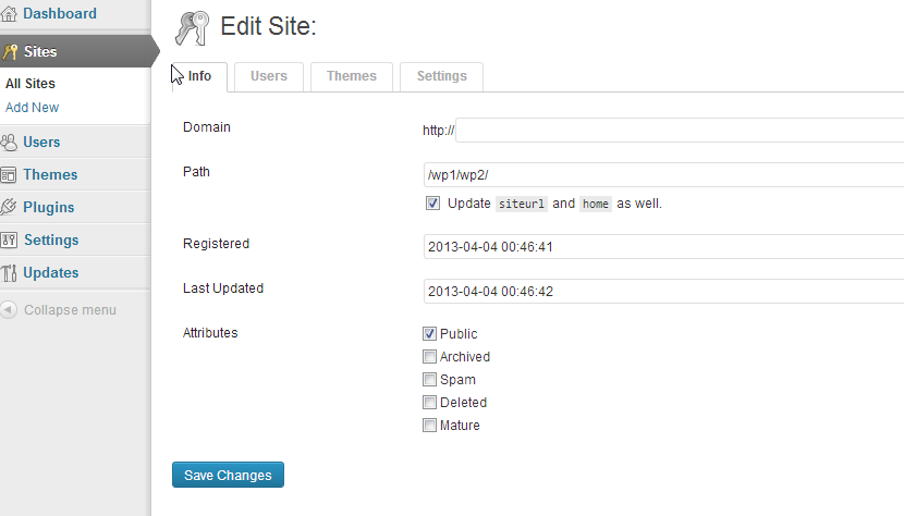 Hover over the Wordpress MS site that you want to edit listed in the PATH column of the displayed table. This will bring up a menu directly under the path name. Click on EDIT.