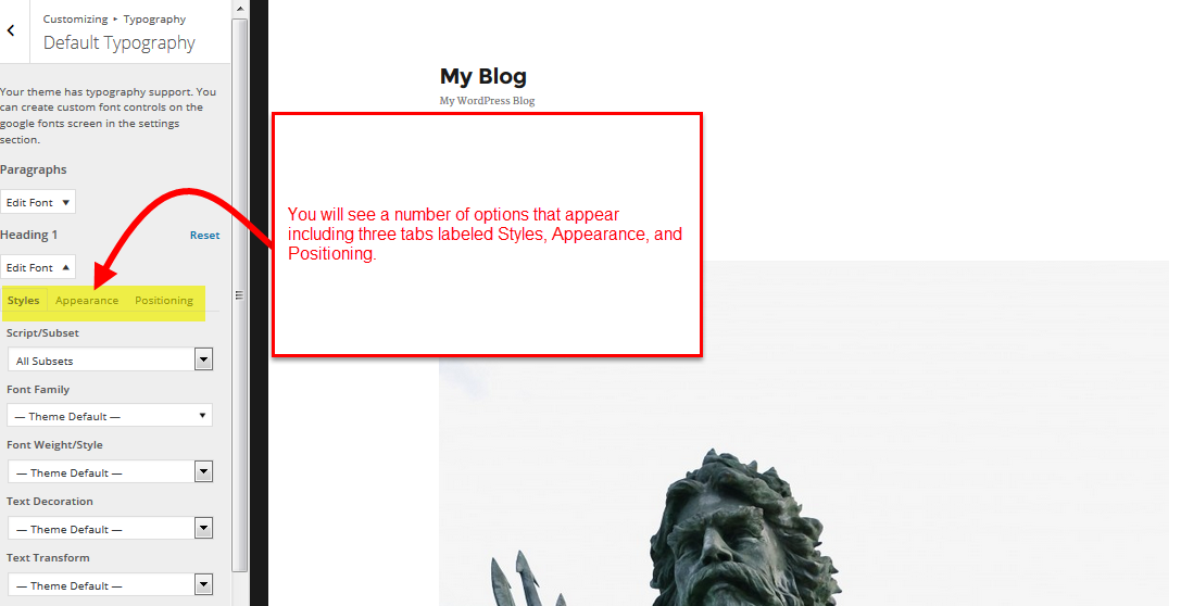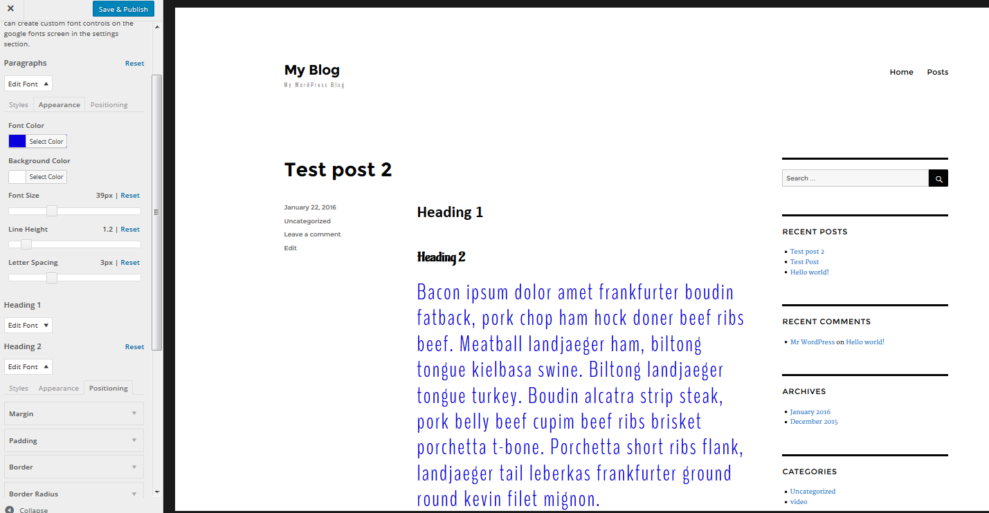You can also click on the Appearance tab or the Positioning tab to change the color and position of the text. If you have your WordPress site set to show Posts (instead of a static page), you can watch the changes to the fonts happen dynamically.