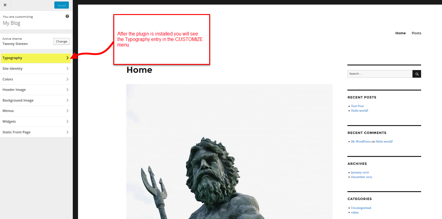 You will notice that there is a newly added menu item called Typography. Note that this option may differ from theme to theme. This tutorial uses the default Twenty-sixteen theme. Click on Typography.