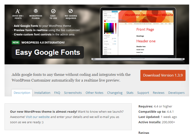 One of the more difficult things to do with a WordPress site, if you're not familiar with using CSS, is changing fonts. The Easy Google Fonts plugin makes it very easy to make changes to fonts without having to touch the CSS code or other WordPress files.