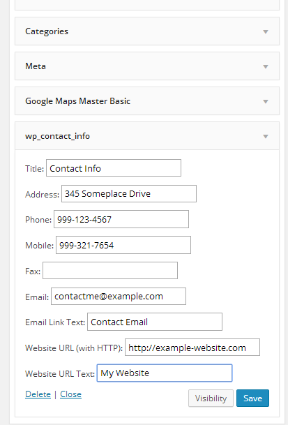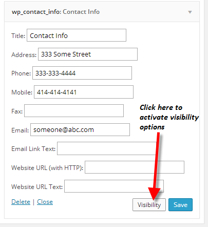 One of the features of the WP Contact Info Widget is the ability to set visibility options. This means that you can set widget to appear only on certain conditions.