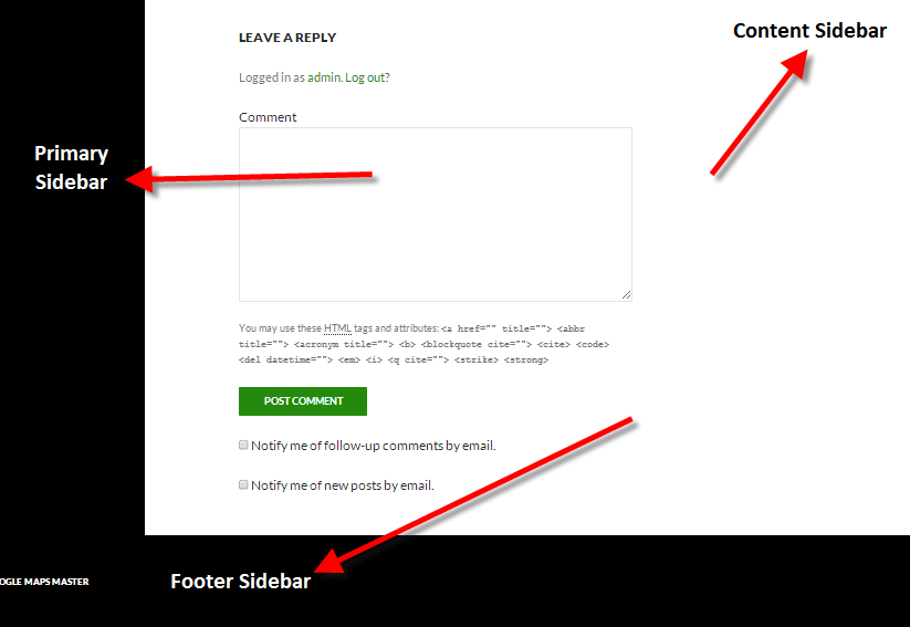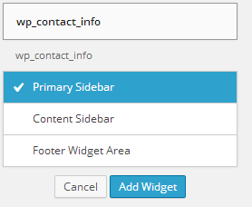 You will see a drop-down menu with three areas that you can select: Primary Sidebar, Content Sidebar, and Footer Widget Area. To understand the areas where the sidebar can appear, see the screenshot below: