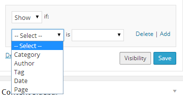 With this setting, you can set conditions to show or hide the contact information based on Category, Author, Tag, Date, or Page. You can also set multiple conditions. Select one of the categories under the Select option, then type in a value for the condition. For example, if you selected "Date" you would see the options available for date:
