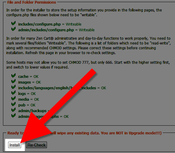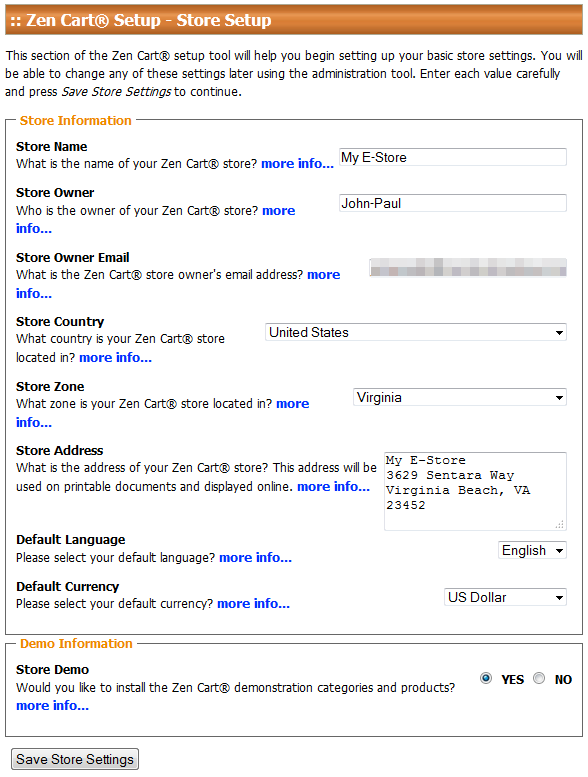 | Store Demo | If you choose Yes, example products will be added. I recommend choosing yes if you are learning Zen Cart, as it can help you determine how to work with the features and menus. |