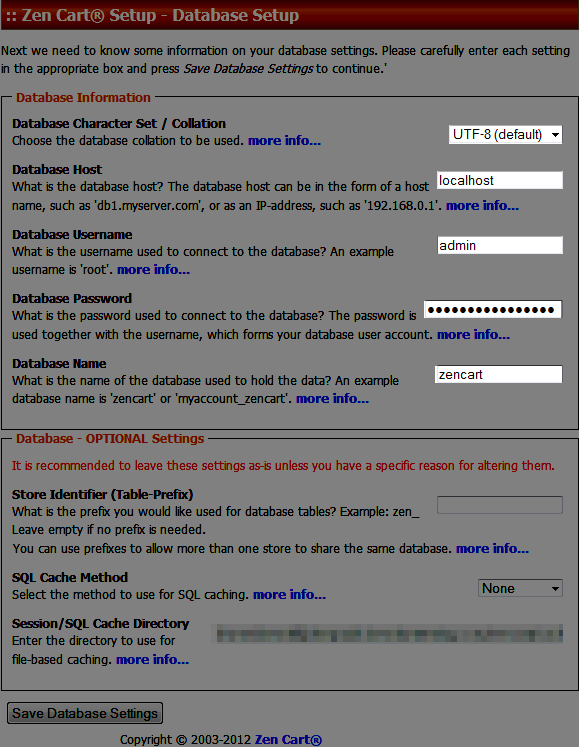 | Database Username | username10_zencart | Enter the database username you setup in step 3. |
