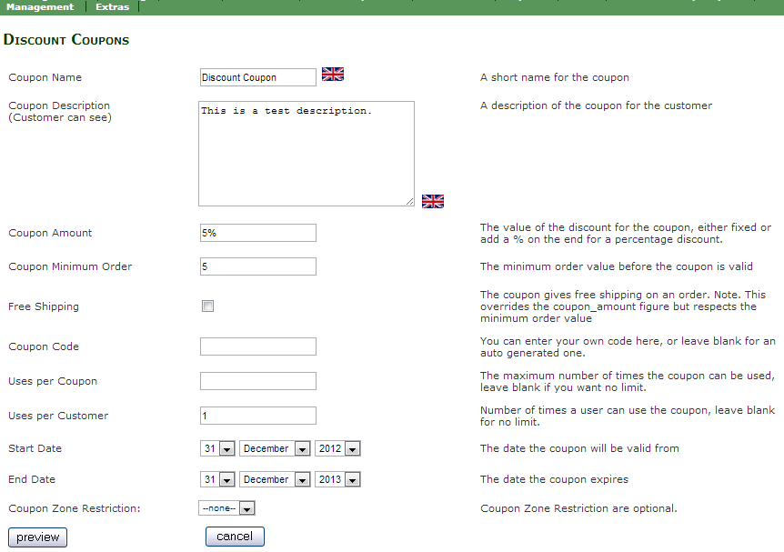 | Coupon Code | You can enter a code name for your coupon, or leave it blank and Zen Cart will generate a code automatically. |