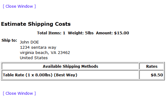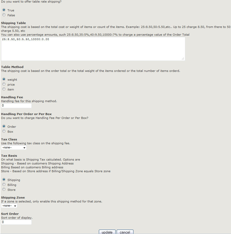 | Enable Table Method | True enables, this shipping option. If you select False, this shipping option will not be available. It will still be installed, just 'turned off.' |