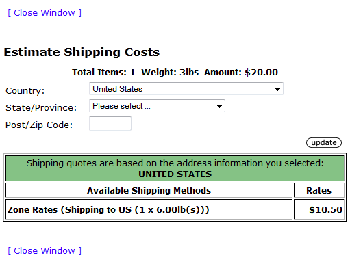 You can also charge a percentage of the order total, for example:20:5.5%, 30:7.25, 10000:3% This would mean by Price: $0-$19.99 = 5.5% $20-$29.99 = $7.25 & $30 or more would be = 3% By Weight this would be: 0-19.99lbs = 5.5% 20-29.99lbs = $7.25 30lbs or more will be = 3% By Item would be: 0-19 items = 5.5% 20-29 items = $7.25 30+ items = 3% |