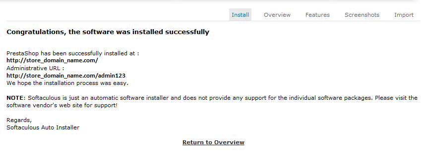 The links given in this final screen will go to the PrestaShop storefront and to the administrator dashboard as per the settings that you selected in the install process.